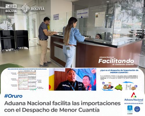 Oruro, 14 de noviembre de 2024. AN.- La Aduana Nacional recuerda que está vigente el Despacho de Importación de Menor Cuantía, que permite a cualquier persona importar mercancías directamente, sin necesidad de contratar un despachante de aduanas y mediante un trámite simplificado. Este régimen aplica a productos cuyo valor no supere los 2,000 dólares, con algunas excepciones, como la importación de vehículos y otros productos prohibidos por la normativa nacional.