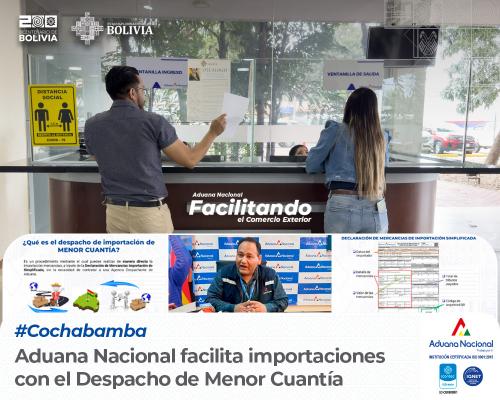 Cochabamba, 19 de noviembre de 2024. AN.- “La Aduana Nacional recuerda que está vigente el Despacho de Importación de Menor Cuantía, para la nacionalización de mercancías que son ingresadas por lo pasos fronterizos de manera peatonal, en el equipaje de viajeros, triciclos, carretillas o balsas, así como las mercancías que traen viajeros internacionales vía aérea. Este despacho de importación aplica a mercancías cuyo valor no supere los 2,000 dólares, con algunas excepciones, como vehículos automotores y mercancías prohibidas por la normativa específica”, aseguró Cristian Antonio Salinas, Administrador Aduana Interior Cochabamba.