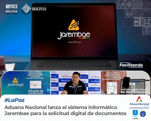 La Paz, 2 de diciembre de 2024. AN.- La Aduana Nacional lanza el sistema informático Jarembae, cuyo nombre en guaraní significa veloz. Este sistema permite solicitar, de manera digital, copias simples, autenticaciones, legalizaciones y certificaciones de documentos administrativos y operativos en un plazo máximo de 10 días.