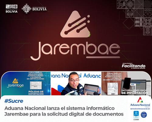 La plataforma Jarembae, lanzada el 27 de noviembre de este año, es parte del plan de modernización de la Aduana Nacional, se suma a la Ventanilla Única de Comercio Exterior (VUCE) plataforma en línea para gestionar certificaciones y autorizaciones previas de importación y exportación de 22 instituciones nacionales, destacó el Administrador Aduana Interior Sucre, Julio César Monasterios.