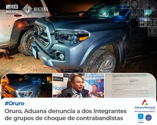 Oruro, 24 de enero de 2025. AN.- La Aduana Nacional aprehendió a dos integrantes de un grupo de choque de contrabandistas y presentó una denuncia penal en su contra por los delitos de favorecimiento y facilitación del contrabando, impedir y estorbar el ejercicio de funciones, y destrucción y deterioro de bienes del Estado y la riqueza nacional, informó el Gerente Regional Oruro de la Aduana Nacional , Olberth Maydana.
