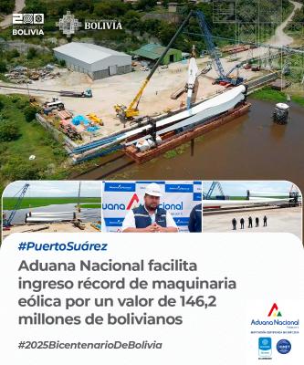 Puerto Suárez, 28 de enero de 2025. AN.- La Aduana Nacional facilita la importación de maquinaria para la instalación de plantas eólicas de la Empresa Nacional de Electricidad (Ende). Esta mercancía de gran volumen ingresó al país a través del Punto de Control Puerto Jennefer, ubicado entre Puerto Suárez y Puerto Quijarro, informó Marco Antonio Zúñiga, Administrador de la Aduana Frontera Puerto Suárez.