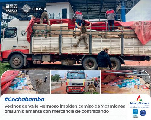 Cochabamba, 30 de enero 2025. AN.- “Policía Nacional al promediar las 11:30 de la mañana advierte a la Aduana Nacional para dar a conocer que dentro de una investigación realizada se encontró camiones con mercadería presumiblemente de contrabando en su interior, activándose de esta manera el Grupo de Reacción Inmediata Aduanera (GRIA), la Unidad de Control Operativo Aduanero (UCOA) y el personal de la Aduana Nacional que se constituyeron en el lugar indicado por la Policía, en la zona de Valle Hermoso, zona sur de Cochabamba” informó Hugo Antonio Domínguez, Gerente Regional Aduana Cochabamba.