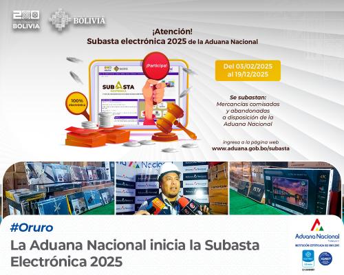 Las mercancías provienen de comisos y abandonos y están bajo custodia de la Aduana Nacional. Serán subastadas a nivel nacional mediante la página web: www.aduana.gob.bo. Conforme mandato legal, la Aduana Nacional subastará mercancías variadas, aptas para uso y consumo, como ser aparatos electrónicos, prendas y accesorios de vestir, artículos de limpieza e higiene personal, juguetes y muchos otros más. Quedan excluidas de la subasta solo aquellas mercancías prohibidas de importación y adjudicación por disposiciones legales vigentes.