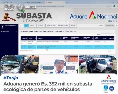Tarija, 10 de febrero de 2025. AN.- “La Gerencia Regional Tarija de la Aduana Nacional, informa a la población que del 24 al 29 de enero de la presente gestión se llevó a cabo la subasta ecológica de 44,95 toneladas de partes de vehículos: 2 vagonetas, 7 automóviles, 2 camiones y 1 ómnibus. Estas mercancías fueron comisadas y abandonadas por contrabando, se subastaron mediante una convocatoria publicada en la página web institucional http://anbsw04.aduana.gob.bo:7777/subastaEcologica/lotelista.do. Una vez adjudicado el lote y recibida la oferta de Bs 352.345 por parte del ganador, se procede a la inutilización”, informó Ludueño Condori, Gerente Regional de Aduana Tarija.