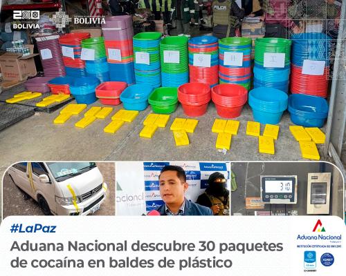 El Alto, 12 de febrero de 2025. AN.- La Aduana Nacional, a través de su regional La Paz, descubrió 30 paquetes de clorhidrato de cocaína, con un peso total de 31 kilos, escondidos en baldes de plástico. Esta mercancía había sido comisada previamente por no contar con documentación legal de importación.