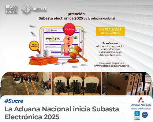 Sucre, 26 de febrero de 2025. AN.- “La Aduana Nacional inició el proceso de subasta electrónica 2025, que se desarrolla desde el lunes 3 de febrero hasta el 19 de diciembre. Se subastarán aproximadamente 800 toneladas de mercancías en buen estado, entre ellas prendas y accesorios de vestir, aparatos electrónicos y artículos de limpieza, entre otros” destacó, el Administrador Aduana Interior Sucre.