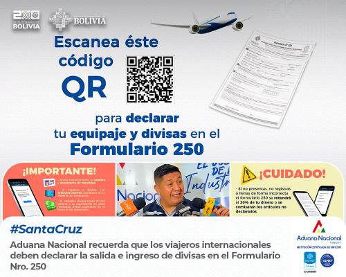 La norma exige que toda persona que entre o salga de Bolivia presente el Formulario Nro. 250 ante la Aduana Nacional. En este documento, debe registrar las divisas que lleva, si el monto está entre 10.000 y 20.000 dólares o su equivalente en otras monedas.