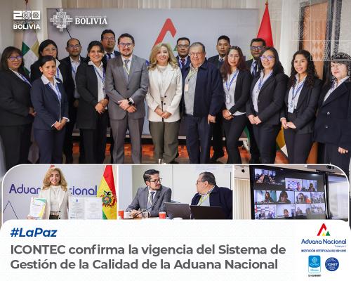 La Paz, 28 de marzo de 2025. AN.- La empresa certificadora ICONTEC confirmó que el Sistema de Gestión de la Calidad de la Aduana Nacional mantiene su vigencia y cumple con los requisitos de la certificación ISO 9001:2015. Esto ocurrió tras la segunda auditoría externa de seguimiento al Sistema de Gestión de la Calidad de esta institución, certificada desde 2023.