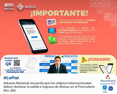 La norma exige que toda persona que entre o salga de Bolivia presente el Formulario Nro. 250 ante la Aduana Nacional. En este documento, debe registrar las divisas que lleva, si el monto está entre 10.000 y 20.000 dólares o su equivalente en otras monedas.