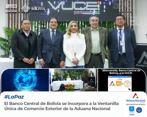 La Paz, 4 de abril de 2025. AN.- El Banco Central de Bolivia (BCB) se integra a la Ventanilla Única de Comercio Exterior (VUCE) de la Aduana Nacional con la emisión en línea del Certificado de Exportación de Oro (CEO). El BCB se convierte en la segunda institución que opera en esta plataforma, después de IBMETRO, que inició el 30 de septiembre de 2024 con la emisión del Certificado Ambiental digital, mediante este sistema informático moderno.
