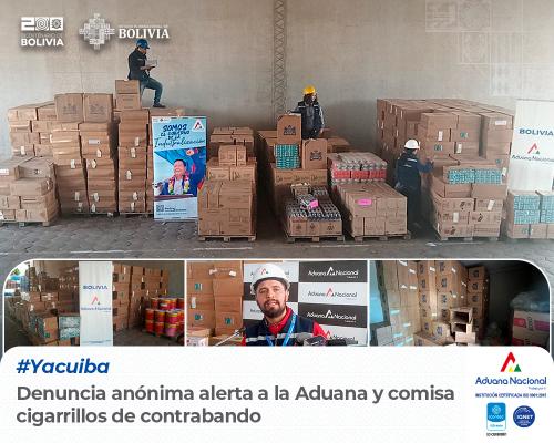 Yacuiba, 4 de abril de 2025. AN.- La Administración Aduana Frontera Yacuiba y la Unidad de Control Operativo Aduanero (UCOA) en atención a una denuncia anónima, realizó un operativo, ejecutándose el mandamiento de allanamiento Nro. 9/2025, logrando comisarse 283 cajas de cartón con cigarrillos de las marcas Rodeo y Hills de origen Paraguayo, con un peso de 3.786 toneladas, afectando al contrabando con un valor CIF de Bs. 331.392,95.