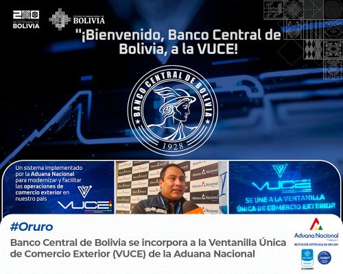 Oruro, 9 de abril de 2025. AN .- El Banco Central de Bolivia (BCB) se integra a la Ventanilla Única de Comercio Exterior (VUCE) de la Aduana Nacional con la emisión en línea del Certificado de Exportación de Oro (CEO). El BCB se convierte en la segunda institución que opera en esta plataforma, después de IBMETRO, que inició el 30 de septiembre de 2024 con la emisión del Certificado Ambiental digital, mediante este sistema informático moderno.