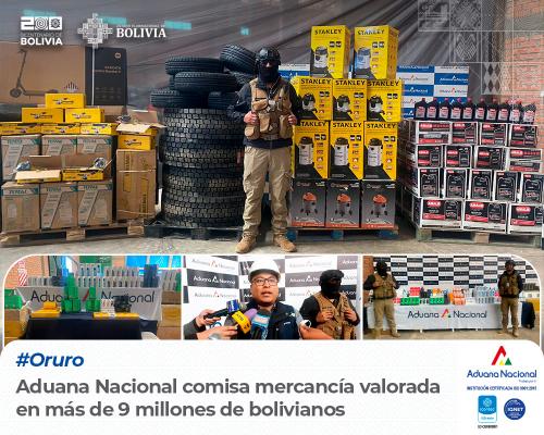 Oruro, 15 de abril de 2025. AN. La Gerencia Regional Oruro de la Aduana Nacional comisó el 3 de abril mercancía extranjera variada, valorada en más de 9 millones de bolivianos, en el Punto de Inspección Aduanera (PIA) Puente Español, Oruro. La mercancía circulaba en territorio nacional sin la documentación legal de respaldo.