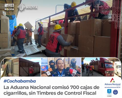 Cochabamba, 29 de abril de 2025. AN.- La Gerencia Regional Cochabamba de la Aduana Nacional, a través, del Grupo de Reacción Inmediata (GRIA) el pasado 17 de abril a horas 12:00, en la Av. Blanco Galindo y Rotonda Reducto, detuvo un camión marca Volvo, tipo FH12, color rojo combinado. Contenía en su interior 700 cajas de cigarrillos de la marca Eros, cada caja contiene 50 paquetes, de 10 cajetillas y cada cajetilla contiene 20 unidades de cigarrillos; se observó que las cajetillas no tenían Timbres de Control Fiscal (TCF), no contaban con fecha de vencimiento y se encontraban malogradas.