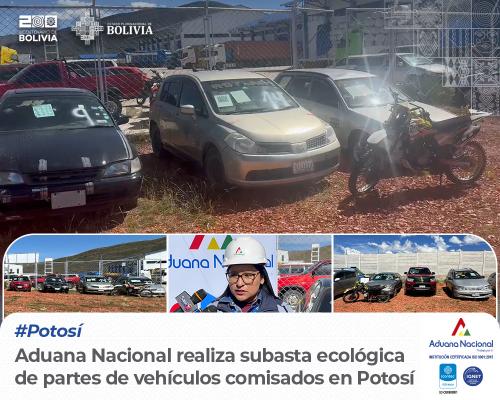 Potosí, 29 de abril de 2025. AN.- La Administración Aduana Interior dependiente de la Gerencia Regional Potosí, invita a toda persona natural o jurídica de carácter público o privado, así como a recicladores u operadores autorizados, a participar de la Subasta Ecológica de mercancía no apta Residuos Especiales de dos (2) lotes de vehículos, cada lote comprende 7 motorizados de diferentes marcas y modelos. Mercancía con un valor omitido de Bs316.854,7.