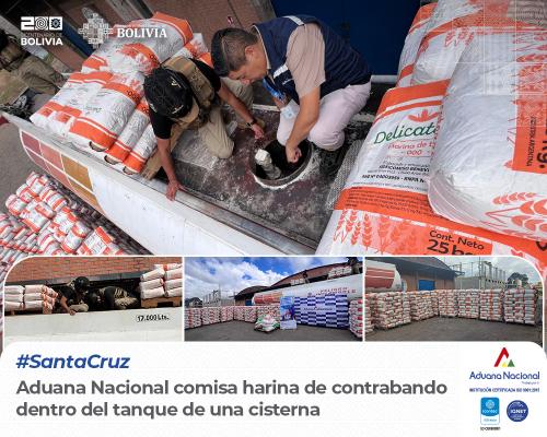 Santa Cruz, 8 de mayo de 2025. AN.- La Aduana Nacional, a través de la Gerencia Regional Santa Cruz, comisó 26,3 toneladas de harina de contrabando de origen argentino, de la marca Delicatezza. La mercancía se encontraba oculta en un tanque cisterna adaptado para el transporte ilegal de productos, que fue interceptado el 5 de mayo en la localidad de Peji, departamento de Santa Cruz.