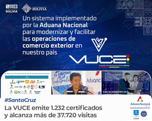 Santa Cruz, 15 de mayo de 2025. AN.- La Ventanilla Única de Comercio Exterior (VUCE), desarrollada por la Aduana Nacional, emitió 1.232 certificados, registró 4.274 usuarios activos y acumuló 37.720 visitas hasta fines de abril.