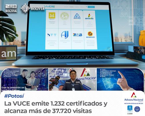 Potosí, 14 de mayo de 2025. AN.- La Ventanilla Única de Comercio Exterior (VUCE), desarrollada por la Aduana Nacional, emitió 1.232 certificados, registró 4.274 usuarios activos y acumuló 37.720 visitas hasta fines de abril.