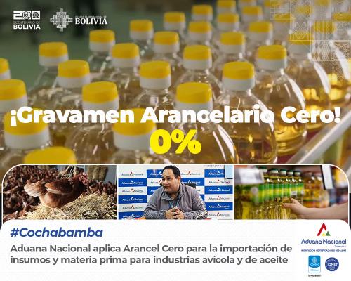 Cochabamba, 29 de mayo de 2025. AN.- El Gobierno del Presidente, Luis Arce, dispuso la reducción del pago de aranceles para la importación de insumos y materias primas destinadas a la producción de aceite y carne de pollo. Esta medida de Gravamen Arancelario Cero busca fortalecer la producción nacional de alimentos de primera necesidad, según el Decreto Supremo N° 5401, aprobado el 23 de mayo, informó el Administrador Aduana Interior Cochabamba, Cristian Antonio Salinas.