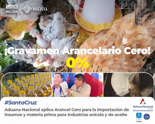 Santa Cruz, 29 de mayo de 2025. AN.- El Gobierno del Presidente, Luis Arce, dispuso la reducción del pago de aranceles para la importación de insumos y materias primas destinadas a la producción de aceite y carne de pollo. Esta medida de Gravamen Arancelario Cero busca fortalecer la producción nacional de alimentos de primera necesidad, según el Decreto Supremo N° 5401, aprobado el 23 de mayo, informó el Gerente Regional de Aduana Santa Cruz, José Luis Mollinedo.