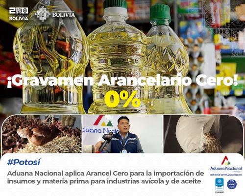 Potosí, 3 de junio de 2025. AN.- El Gobierno del Presidente, Luis Arce, dispuso la reducción del pago de aranceles para la importación de insumos y materias primas destinadas a la producción de aceite y carne de pollo. Esta medida de Gravamen Arancelario Cero busca fortalecer la producción nacional de alimentos de primera necesidad, según el Decreto Supremo N° 5401, aprobado el 23 de mayo, informó el Gerente Regional Aduana Potosí, Álex Yamil Mamani.