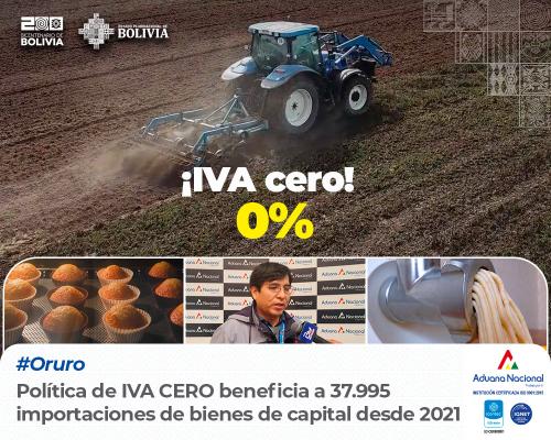 Oruro, 18 de junio de 2025. AN.- El Gobierno de Luis Arce implementó en agosto de 2021 la política de IVA CERO para la importación de bienes de capital, que representa la nacionalizaron 37.995 máquinas en el periodo 2021-2024. Estas importaciones, que alcanzan un valor de 9.742 millones de bolivianos en valor CIF (costo, seguro y flete), fortalecieron principalmente los sectores agrícola y manufacturero. La medida generó un sacrificio fiscal de 1.472 millones de bolivianos, monto que la Aduana Nacional ha dejado de percibir en beneficio de los productores bolivianos, informó el Administrador de Aduana Interior Oruro, Hernán Alarcón.