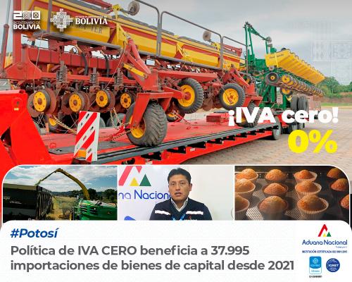 Potosí, 25 de junio de 2025. AN.- El Gobierno de Luis Arce implementó en agosto de 2021 la política de IVA CERO para la importación de bienes de capital, que representa la nacionalización de 37.995 máquinas en el periodo 2021-2024. Estas importaciones, que alcanzan un valor de 9.742 millones de bolivianos en valor CIF (costo, seguro y flete), fortalecieron principalmente los sectores agrícola y manufacturero. La medida generó un sacrificio fiscal de 1.472 millones de bolivianos, monto que la Aduana Nacional ha dejado de percibir en beneficio de los productores bolivianos, informó Álex Yamil Mamani, Gerente Regional Aduana Potosí.