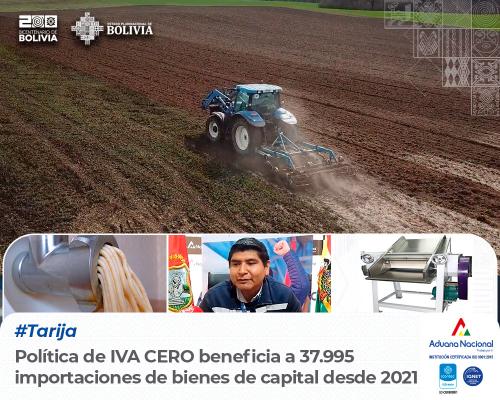 Tarija, 15 de julio de 2025. AN.- El Gobierno de Luis Arce implementó en agosto de 2021 la política de IVA CERO para la importación de bienes de capital, que representa la nacionalización de 37.995 máquinas en el periodo 2021 - 2024. Estas importaciones, que alcanzan un valor de 9.742 millones de bolivianos en valor CIF (costo, seguro y flete), fortalecieron principalmente los sectores agrícola y manufacturero. La medida generó un sacrificio fiscal de 1.472 millones de bolivianos, monto que la Aduana Nacional ha dejado de percibir en beneficio de los productores bolivianos, informó Ludueño Condori, Gerente Regional Aduana Tarija.