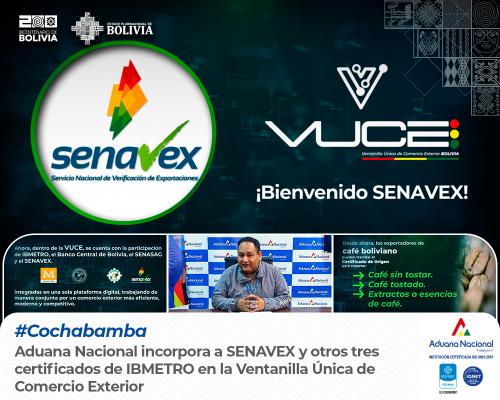 Cochabamba, 23 de julio de 2025. AN.- La Aduana Nacional anuncia la incorporación del Servicio Nacional de Exportaciones (SENAVEX) a la Ventanilla Única de Comercio Exterior (VUCE), con la emisión del Certificado del Café. Además, el Instituto Boliviano de Metrología (IBMETRO) amplía su participación con tres nuevos certificados, también disponibles mediante la plataforma digital, informó el Administrador de Aduana Interior Cochabamba, Cristian Salinas.