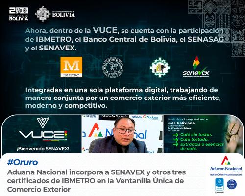 Oruro, 24 de julio de 2025. AN.- La Aduana Nacional anuncia la incorporación del Servicio Nacional de Exportaciones (SENAVEX) a la Ventanilla Única de Comercio Exterior (VUCE), con la emisión del Certificado del Café. Además, el Instituto Boliviano de Metrología (IBMETRO) amplía su participación con tres nuevos certificados, también disponibles mediante la plataforma digital, informó el Gerente Regional de Aduana Oruro, Olbeth Maydana.