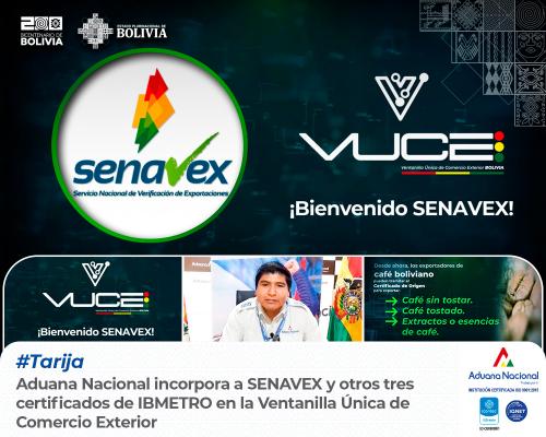 Tarija, 31 de julio de 2025. AN.- La Aduana Nacional informa la incorporación del Servicio Nacional de Exportaciones (SENAVEX) a la Ventanilla Única de Comercio Exterior (VUCE), con la emisión del Certificado del Café. Además, el Instituto Boliviano de Metrología (IBMETRO) amplía su participación con tres nuevos certificados, también disponibles mediante la plataforma digital.