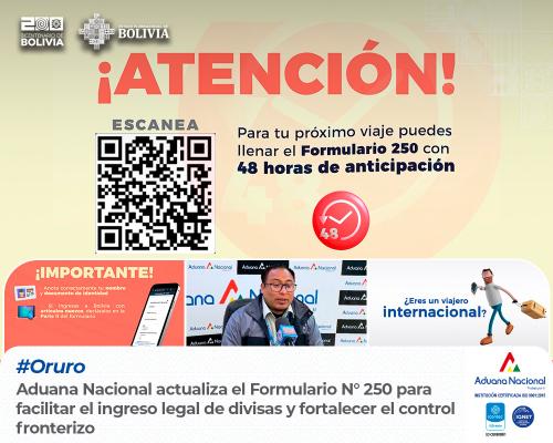 Oruro, 14 de agosto de 2025. AN.- La Aduana Nacional actualizó el Formulario N° 250 para la aplicación del Régimen de Viajeros y Control de Divisas, en cumplimiento al Decreto Supremo Nº 5404 de 23 de mayo de 2025, que busca facilitar el ingreso de divisas al país y fortalecer el control transfronterizo, informó el Gerente Regional de Aduana Oruro, Olberth Maydana.