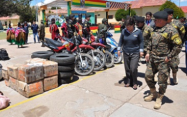 La Presidenta de la Aduana Nacional, Marlene Ardaya felicitó a las autoridades de Fuerzas Armadas por su labor “porque no solo se comisa combustible, sino también motocicletas, vehículos indocumentados y otro recurso natural como la madera”.