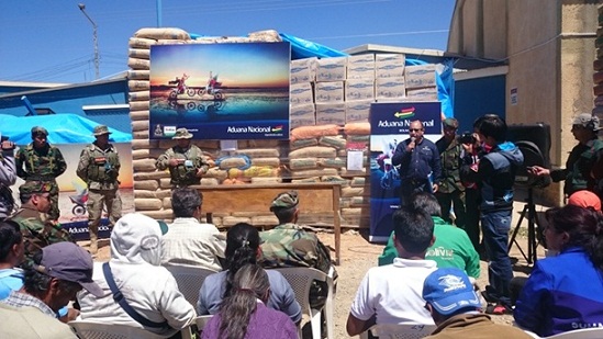 Este viernes, la Aduana Nacional informó que en los últimos días la institución entregó cerca de 30 toneladas de alimentos a comunidades vecinas de la ciudad de Villazón, al sur del departamento de Potosí, como parte de las recompensas por las denuncias realizadas contra el contrabando. El Gerente Regional Potosí, Waldo Aramayo destacó que esta es una clara respuesta de la Aduana a las comunidades que coayduvan al Estado boliviano para que el ingreso de mercancías al país se haga por la Aduana, siguiendo procedimientos establecidos y no por la vía del contrabando. Por su parte, el Segundo Comandante del Regimiento Chichas 7 de Caballería, Mayor Zelaya relievó el trabajo realizado en coordinación con funcionarios de la Aduana y las Fuerzas Armadas en la región. Durante la recepción y la firma de las DUI’s por el Alcalde del Municipio de Villazón Jorge Acho y los Corregidores de las comunidades, estos expresaron su gratitud y felicitación a la Aduana por el trabajo demostrado en la gestión 2015 y estos primeros meses de 2016, denotando que la población de Villazón se va educando en los procedimientos aduaneros. Asimismo pidieron que la población siga realizando las denuncias correspondientes, para que deriven en beneficio de la región. De esta forma la administración aduanera de Potosí aplica la Resolución de Directorio N° 01-004-13 que aprueba el “Procedimiento para la denuncia y entrega de mercancías comisadas por ilícitos de contrabando”, mismo que contempla la entrega de 10% al municipio donde se realizó la captura y 40% a las comunidades que denuncian. La entrega de 30 toneladas de alimentos, corresponde a una denuncia realizada el 4 de diciembre de 2015 que permitió interceptar cinco camiones Volvo, en acciones coordinadas entre el Regimiento Chichas 7 de Caballería y servidores públicos de la Aduana Frontera Villazón. Esta entrega es la segunda que se realiza en Villazón, se prevé realizar otras más durante el presente año.
